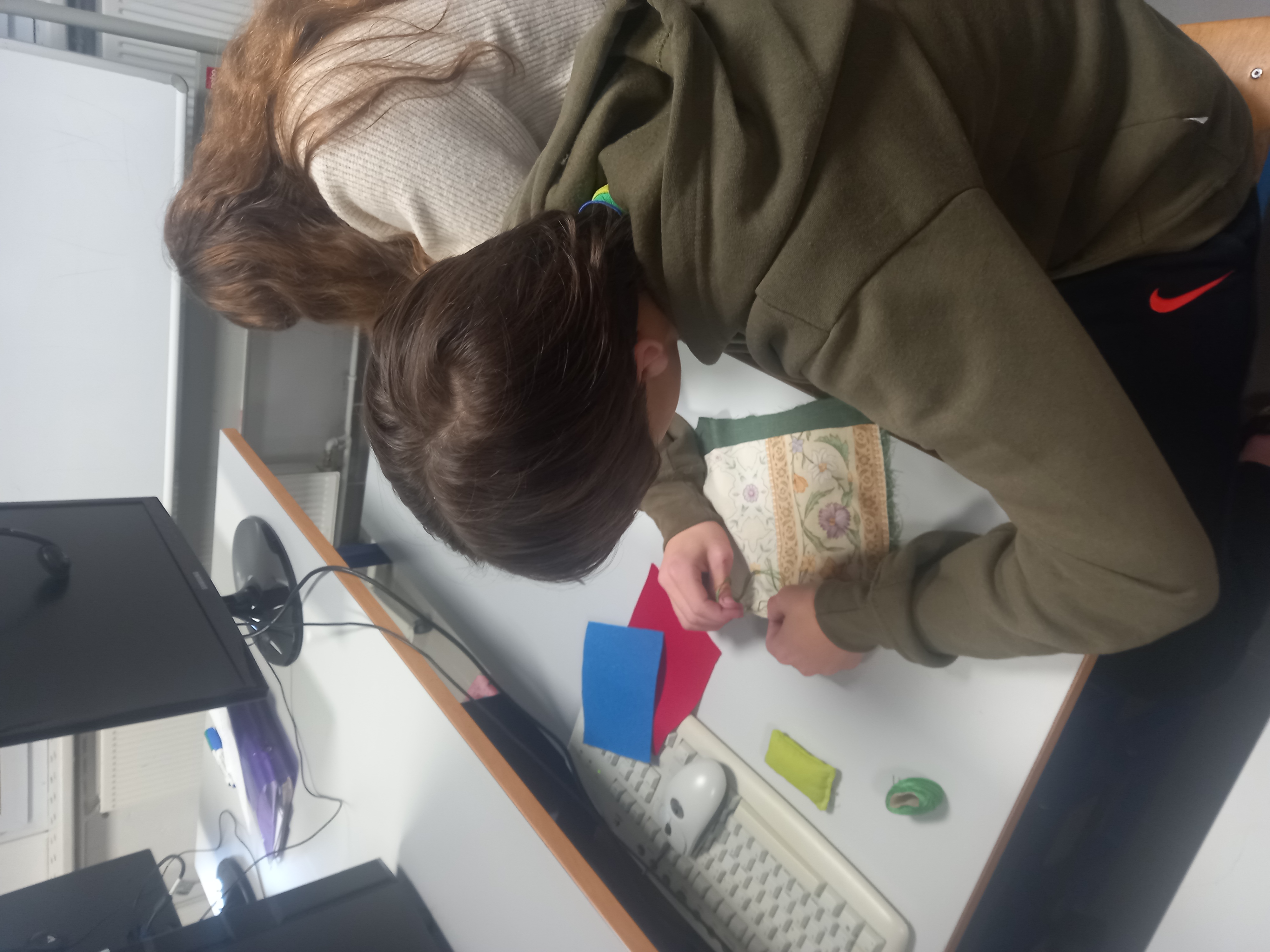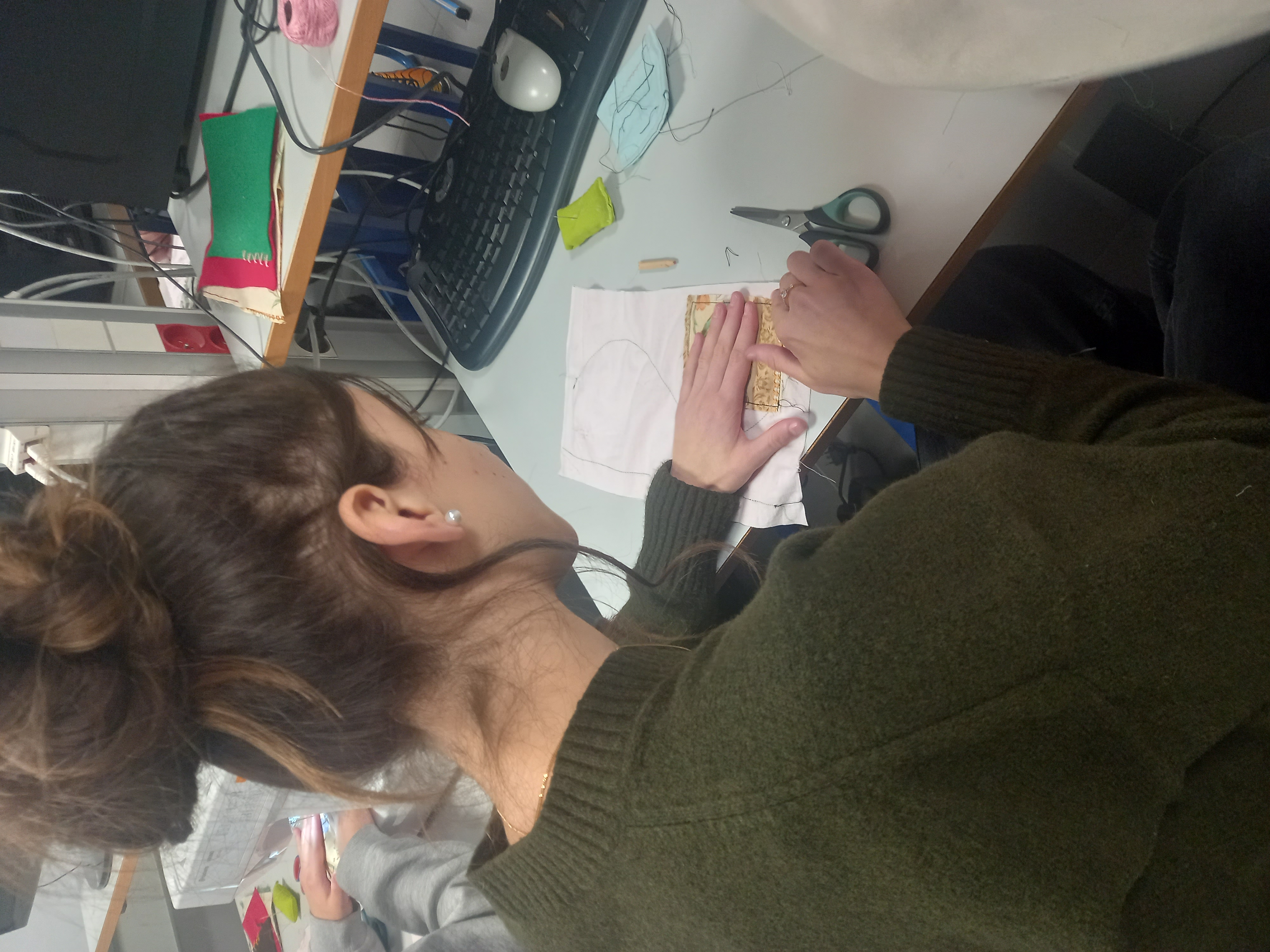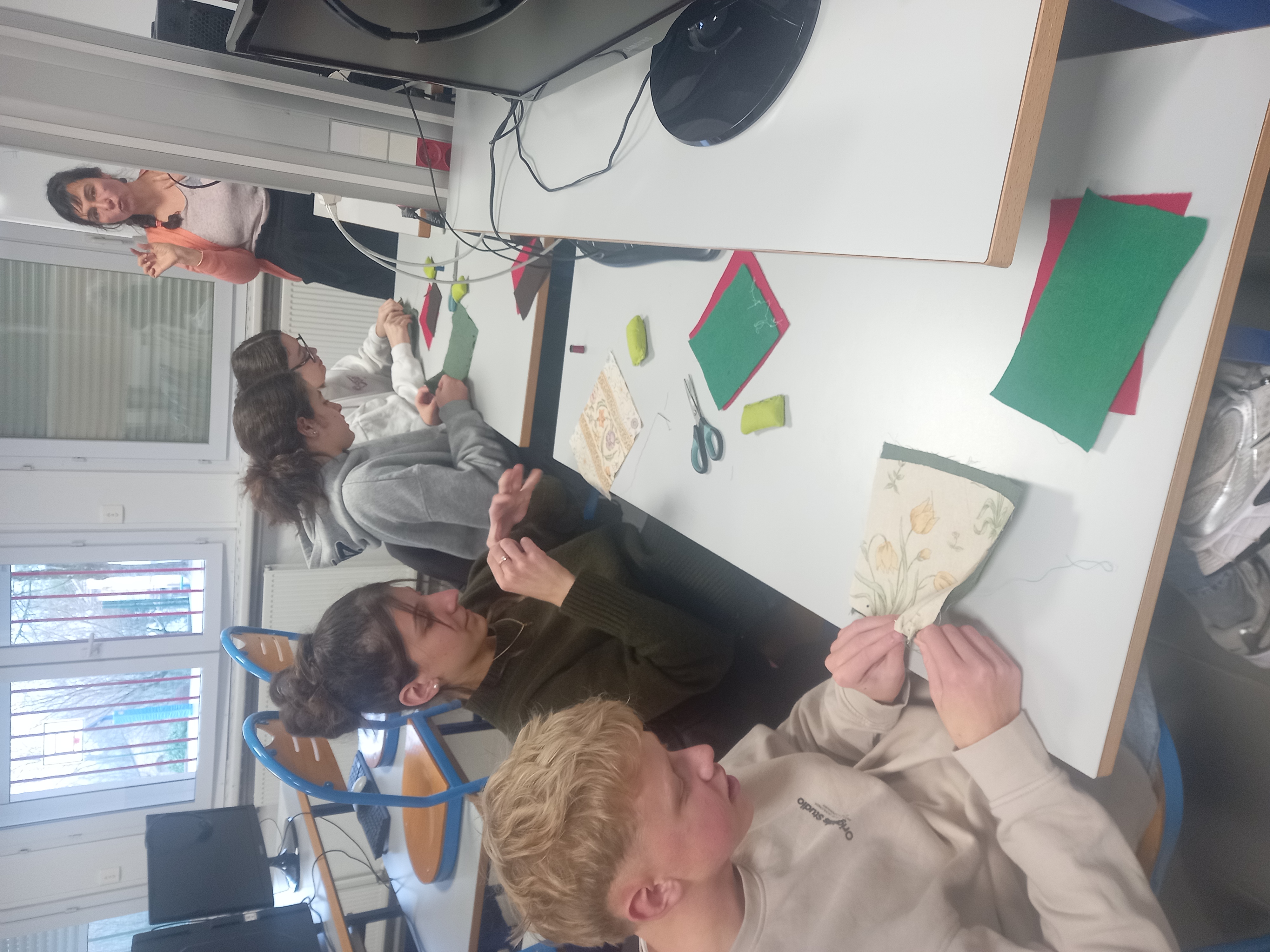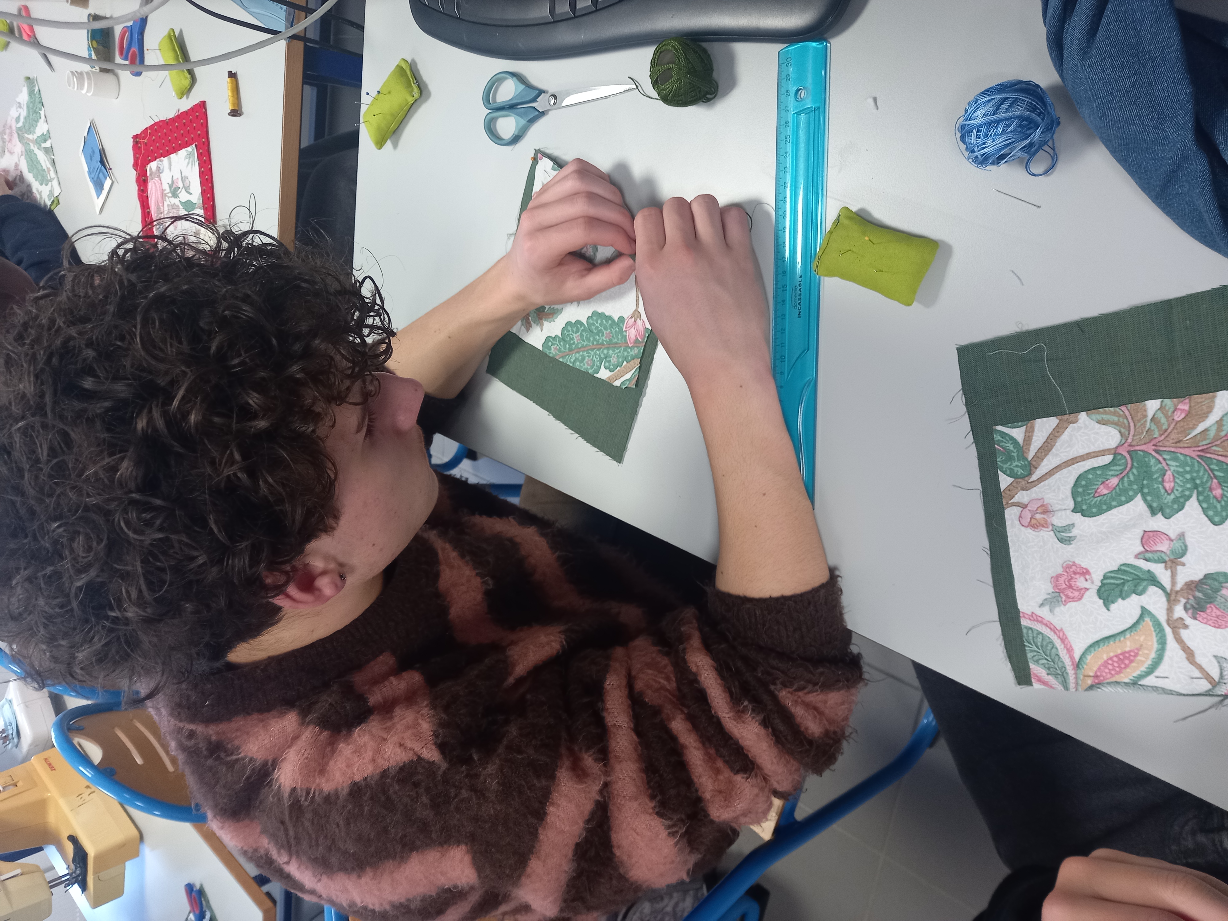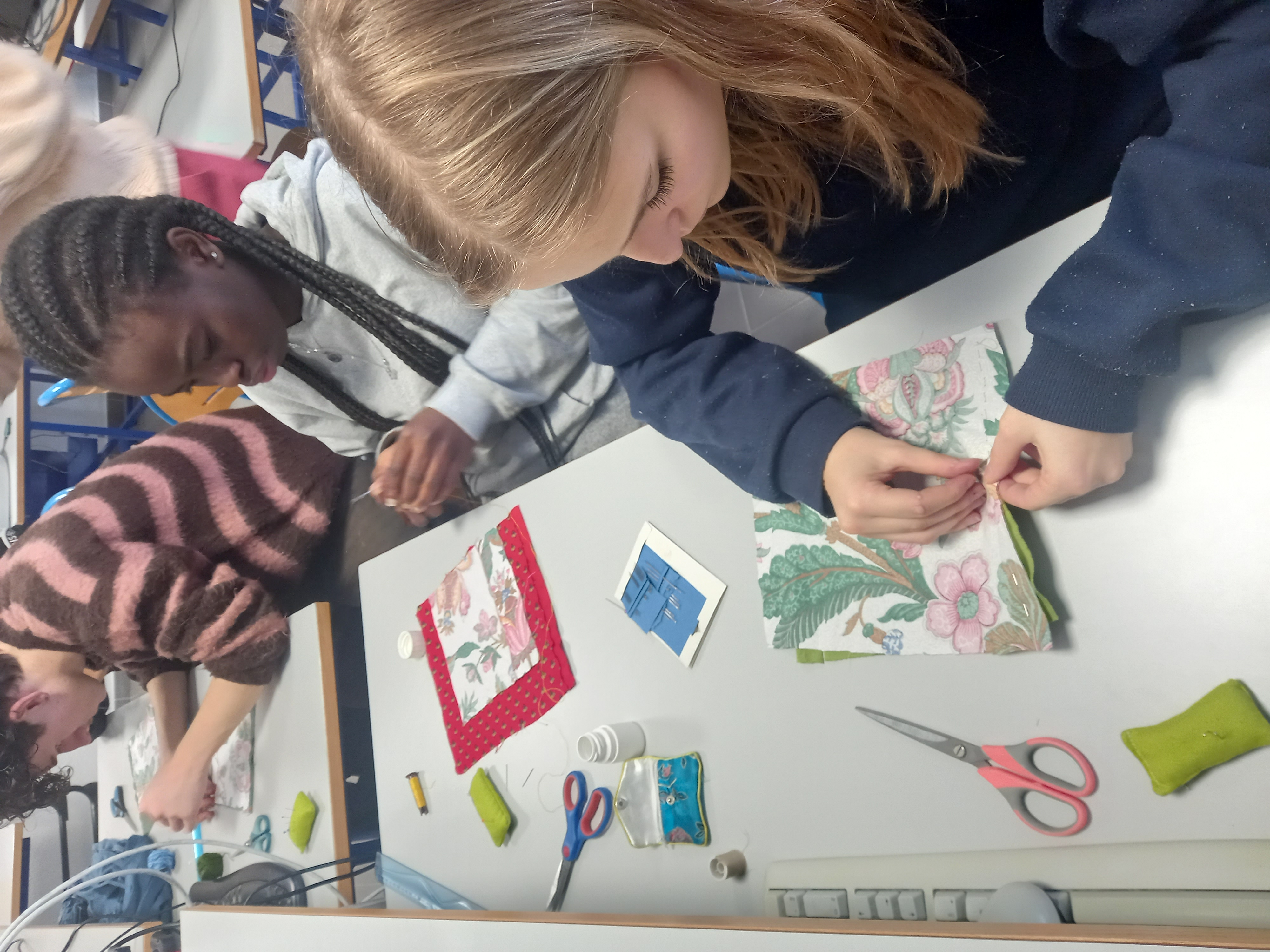 Présente à deux reprises, les mardis, elle a travaillé avec les élèves en demi-groupe afin de favoriser la manipulation et l’accompagnement individualisé. L’intervention a débuté par l’apprentissage des techniques de base de la couture à la main : point avant, point arrière et points fantaisie. Les élèves ont ainsi découvert les gestes essentiels pour assembler, consolider ou décorer un tissu, tout en développant patience, précision et motricité fine.